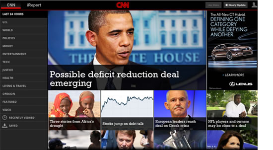 In the above picture, Rockwell is seen in the application of the headline 'Possible deficit reduction deal emerging'. Coupled with a concerned and contemplative image of Barrack Obama, the headline immediately implies importance and relevance to its readers.